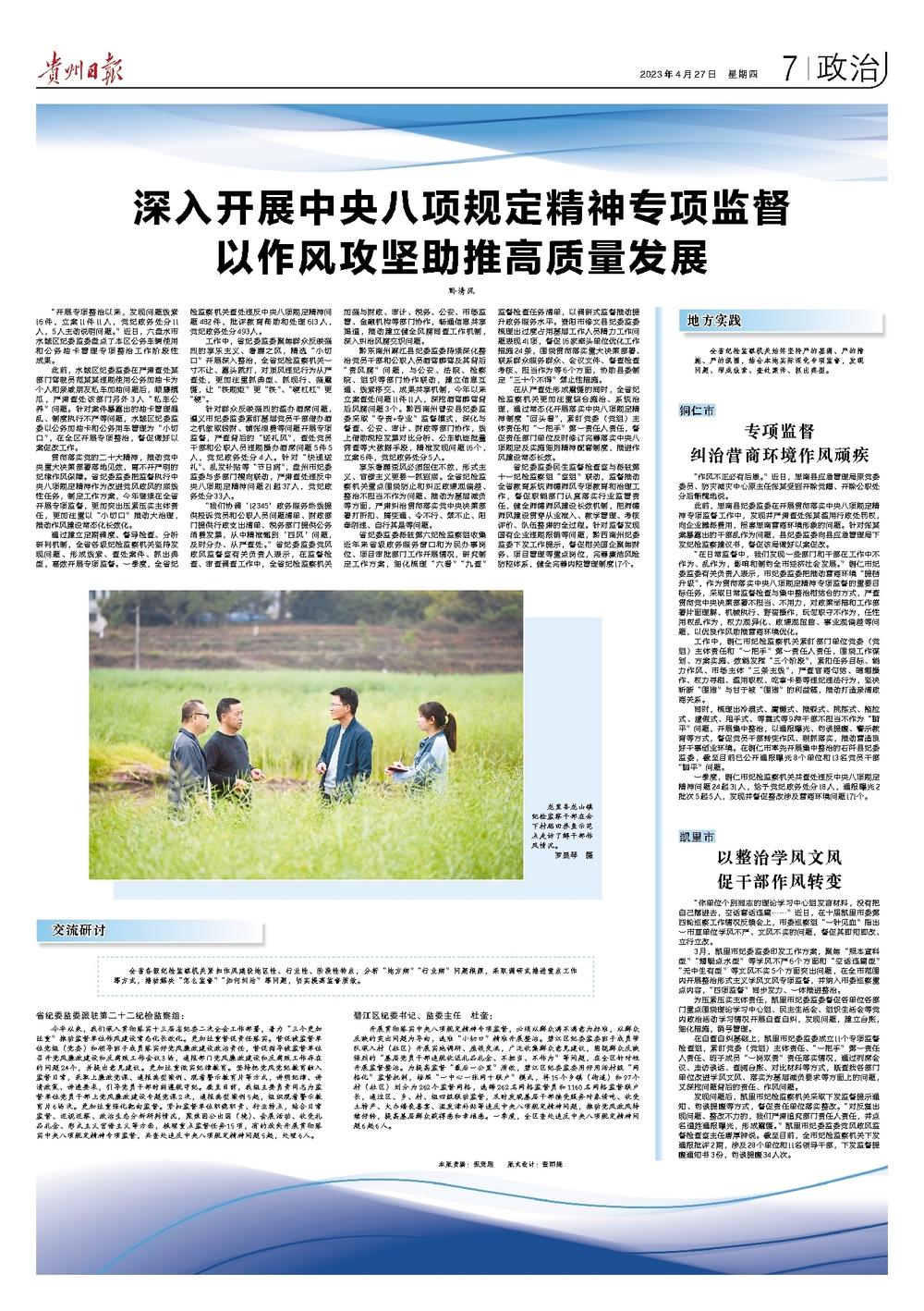3月,凯里市纪委监委印发工作方案,聚焦“照本宣科型”“蜻蜓点水型”等学风不严6个方面和“空话连篇型”“无中生有型”等文风不实5个方面突出问题,在全市范围内开展整治形式主义学风文风专项监督,并纳入市委巡察重点内容,“四项监督”同步发力、一体推进整治。